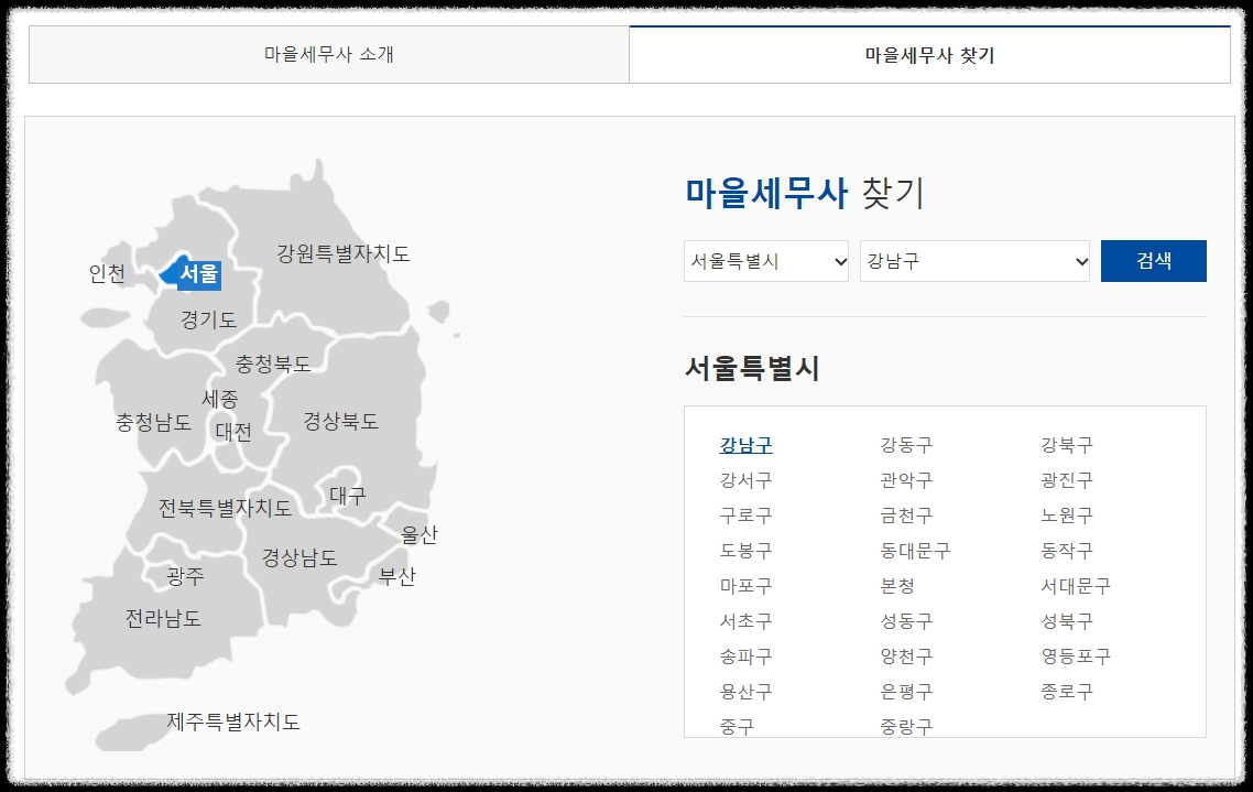 지역을 설정하면 아래와 같이 우리 동네 마을 세무사를 찾을 수 있습니다.
