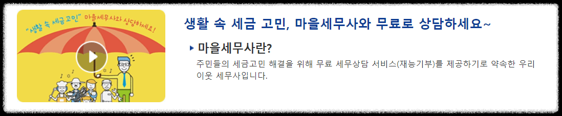 세금 문제로 고민 중이신가요? 인터넷 검색으로도 해결방안을 찾기 어렵고, 세무 상담을 받고 싶어도 아는 세무사가 없을뿐더러 높은 상담료가 부담된다면 '마을 세무사'를 활용해 보세요.